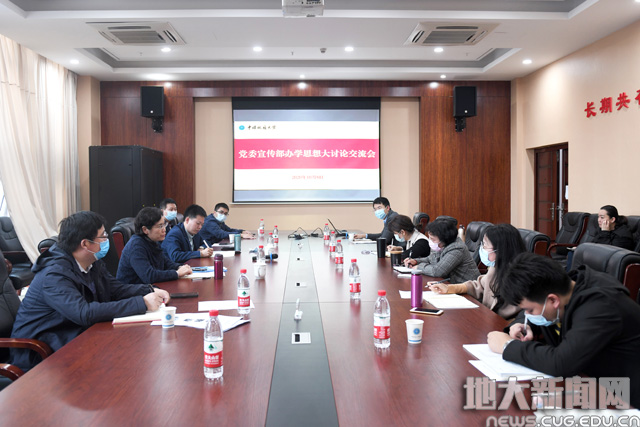 地大新闻网讯(记者毛国樨 摄影张玉贤 田甜)10月8日,校党委宣传部在南望山校区教学综合楼召开办学思想大讨论专题研讨会。校党委书记黄晓玫、党委宣传部全体成员参加研讨。党委宣传部部长胡守庚主持研讨。