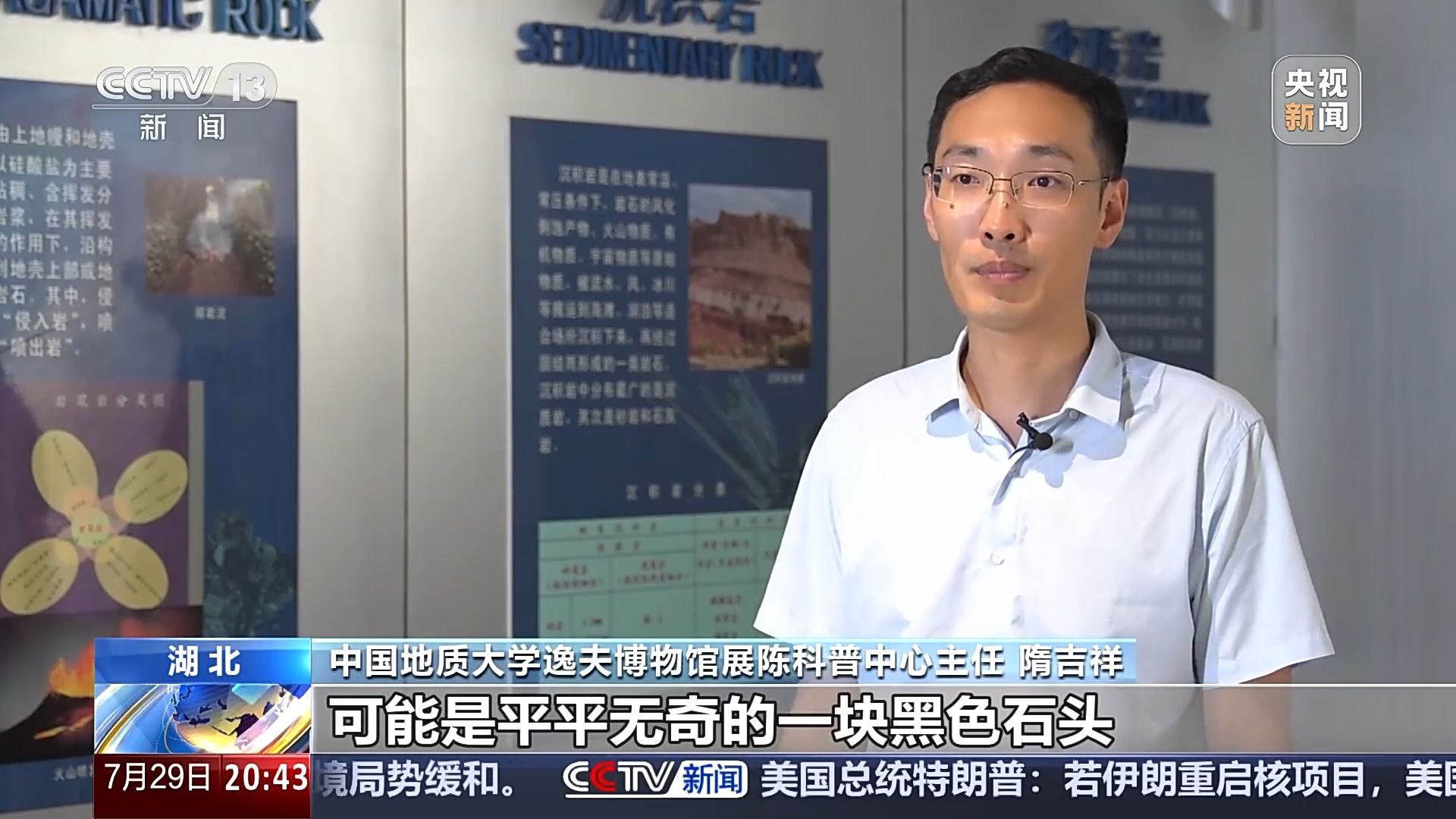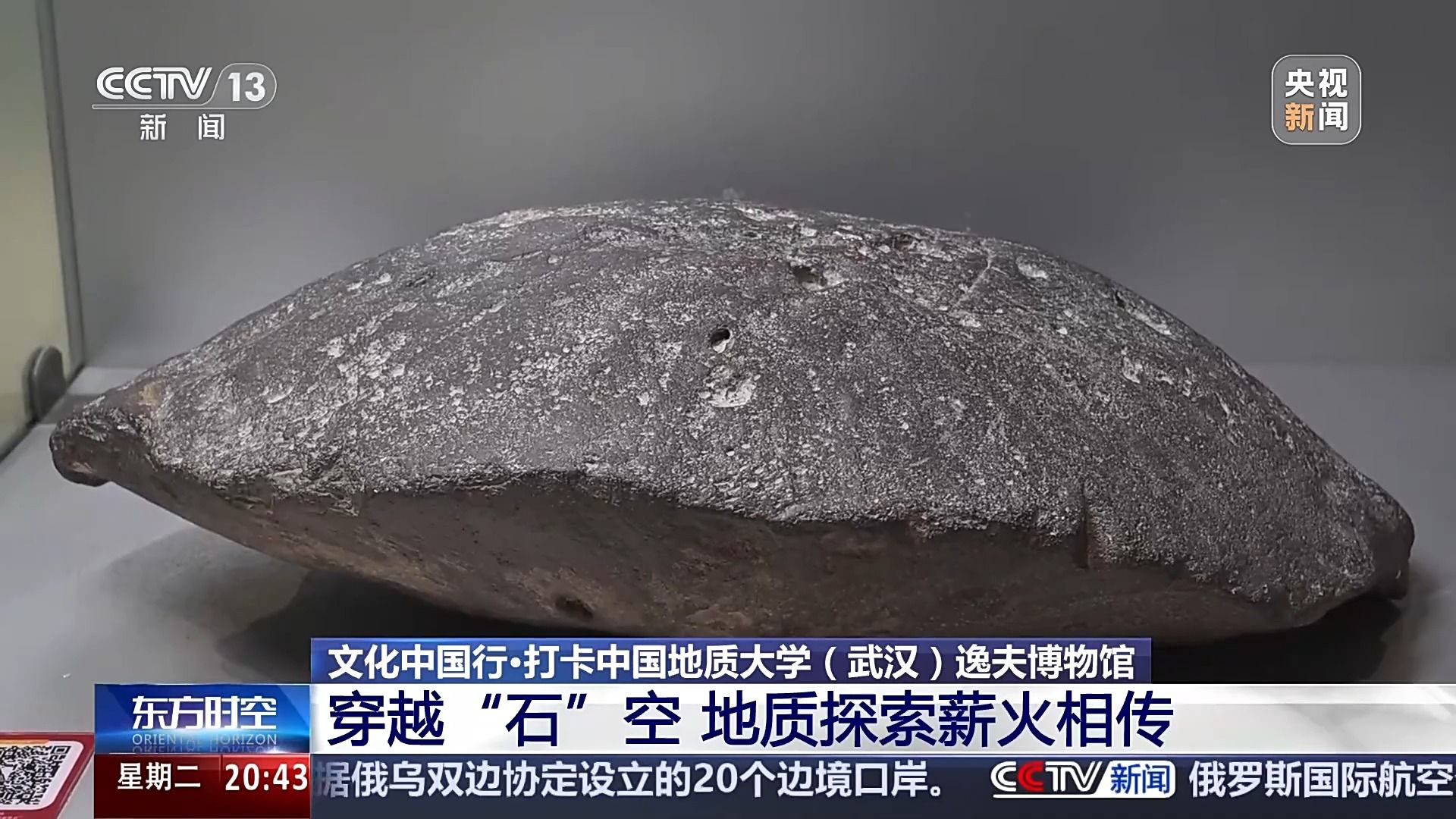 中国地质大学逸夫博物馆展陈科普中心主任 隋吉祥:从外表上看起来就是平平无奇的一块黑色石头,但其实它是大有来历的,是由火山喷发出来的岩浆在空中快速冷凝形成的一种固态物质,叫作“火山弹”,它本身的形态,包括它的成分以及它的落点,都会对研究火山提供很多宝贵的信息。
