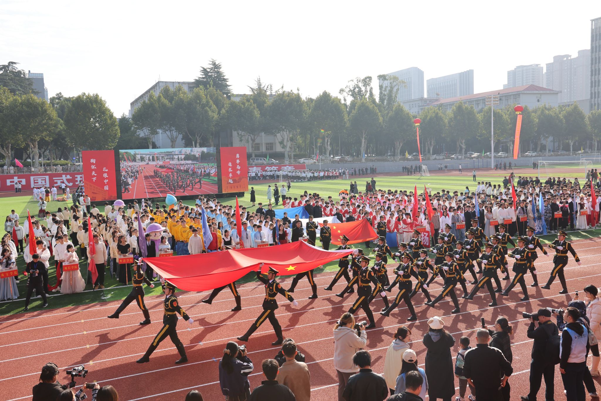 国旗班迈着铿锵有力的步伐,护送国旗出场,绕场展示,全体师生深情凝望,爱国之情在心中澎湃涌动。
