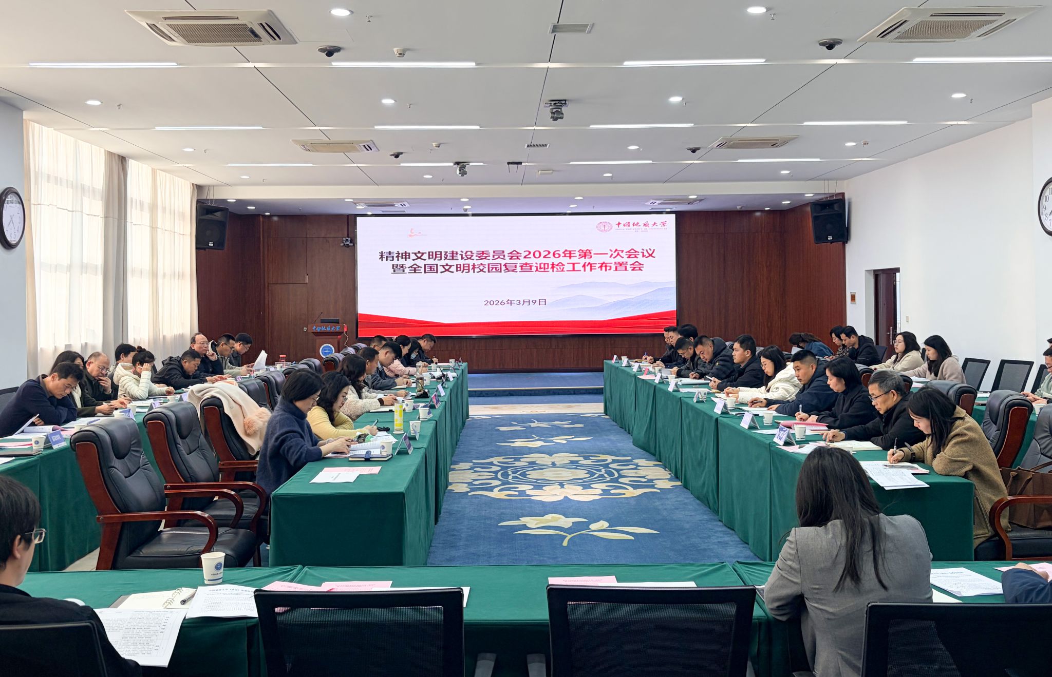 地大新闻网讯(记者 王诲) 3月9日,我校精神文明建设委员会2026年第一次会议暨全国文明校园复查迎检工作布置会在南望山校区东区教学综合楼A708会议室召开。校党委副书记王林清、全国文明校园创建成员单位负责人及相关工作人员参加会议。党委宣传部部长徐绍红主持会议。